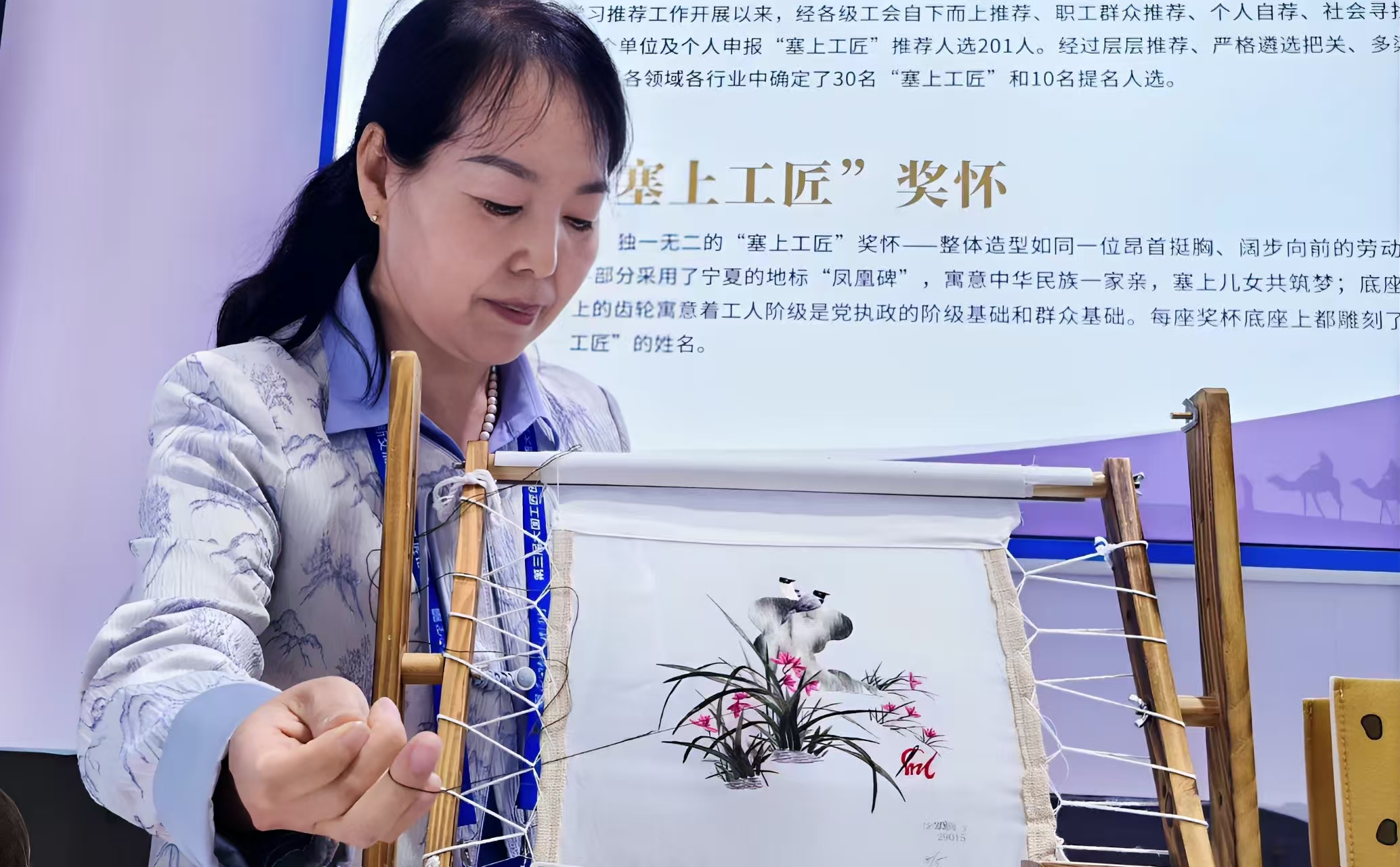 宁夏新闻网重庆讯(记者 闫文丽 文/图/视频)9月26日,在第三届全国工匠大会上,宁夏西吉县非遗传承人、自治区劳动模范马兰带来的刺绣作品与产业实践案例,受到与会者的普遍关注。其通过非遗技艺带动农村妇女就业、促进文旅融合发展的模式,成为会场讨论的亮点之一。