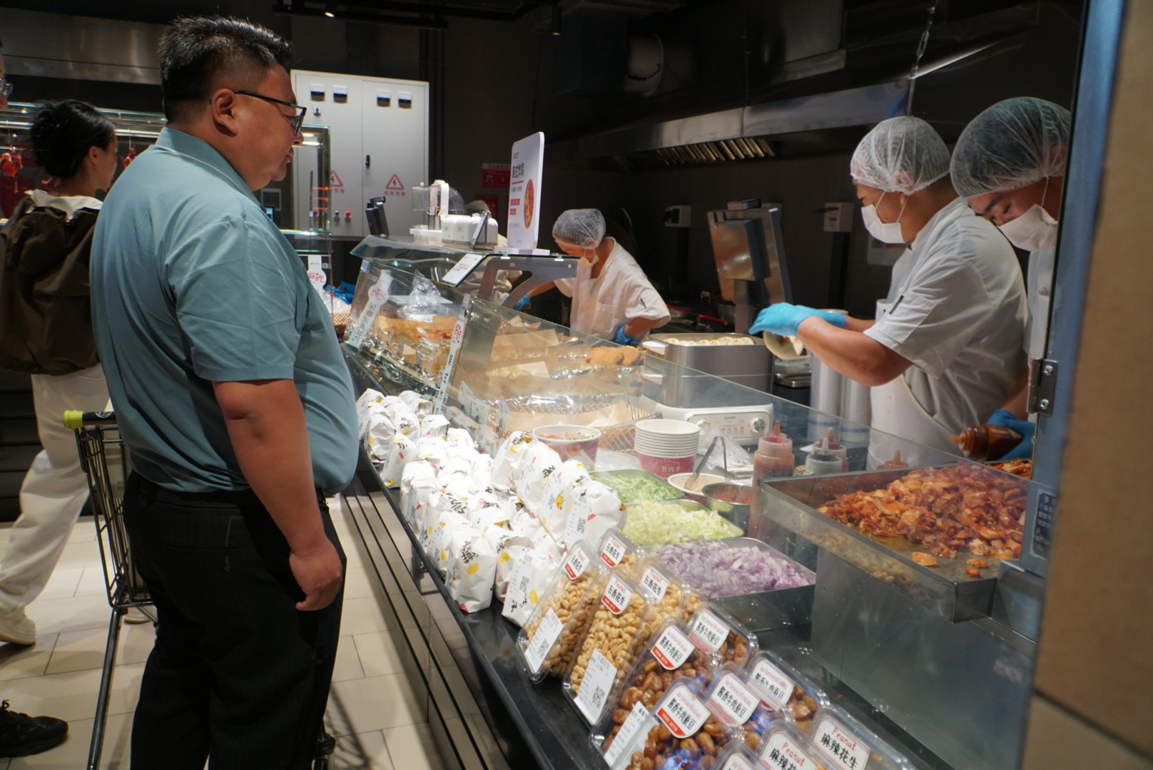 市民吴先生选购了一只刚出炉的烤鸭后,又来到生鲜区,一边选购搭配合理、数量适中的海鲜分装产品,一边感慨道:这些新鲜的牛羊肉、海鲜和蔬菜充满了烟火气,激发了购物者为家人准备丰盛餐食的欲望。