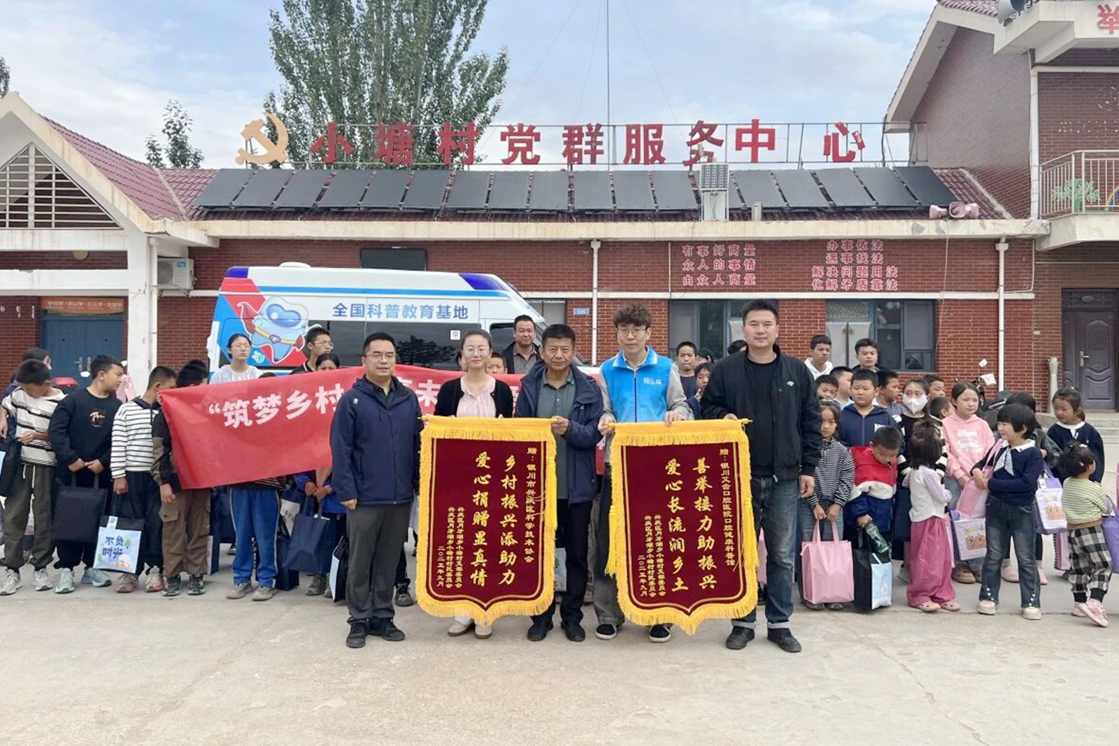 活动现场,银川艾齿口腔医院口腔健康科普馆馆长康博文、兴庆区科协相关负责人与小塘村驻村书记共同为孩子们发放“成长幸福包”,孩子们纯真的笑容在村庄里绽放。
