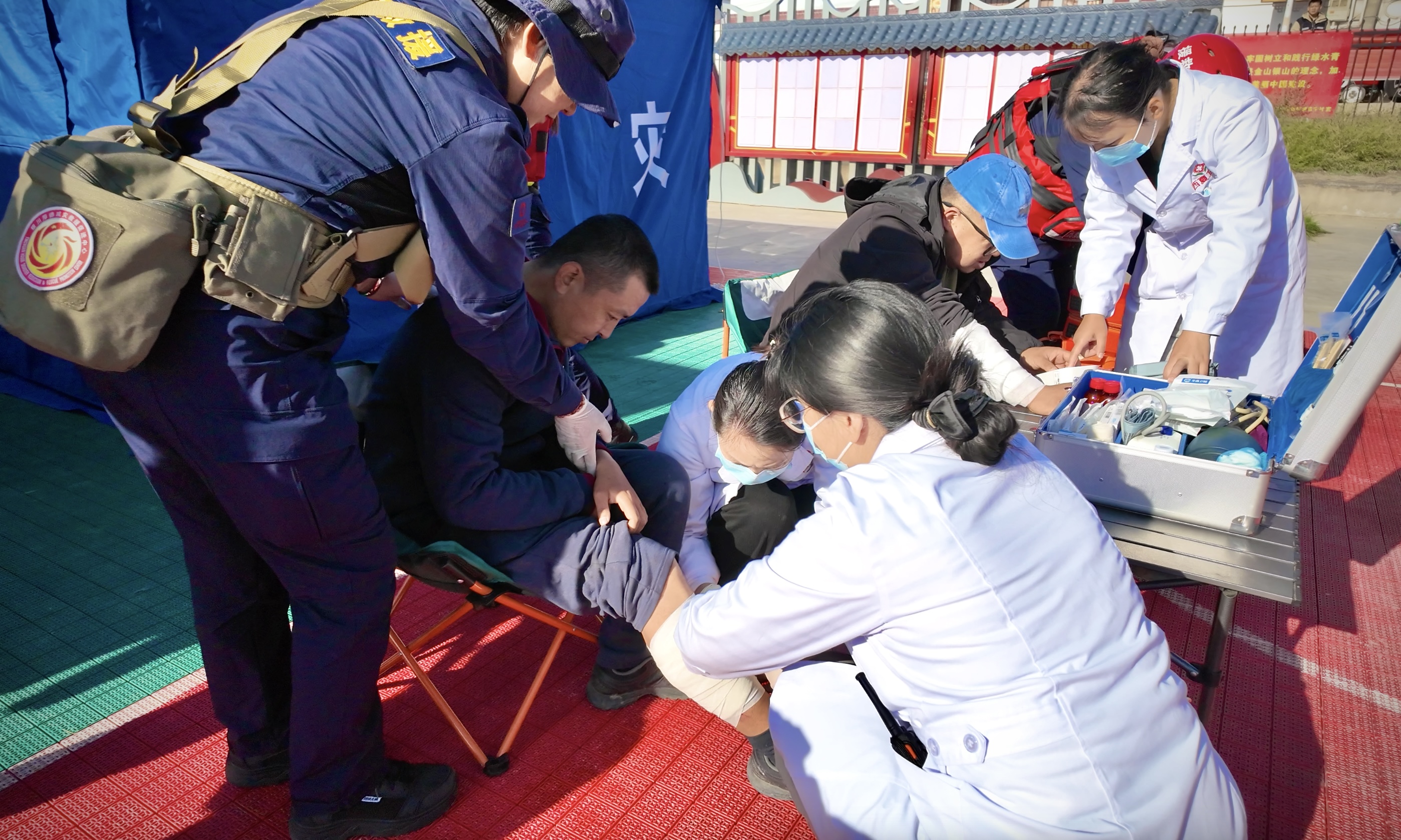 在应急救护培训区,救护人员面对面讲解,手把手指导,鼓励群众动手实操,确保他们真正掌握应急避险与自救互救的实际操作能力。