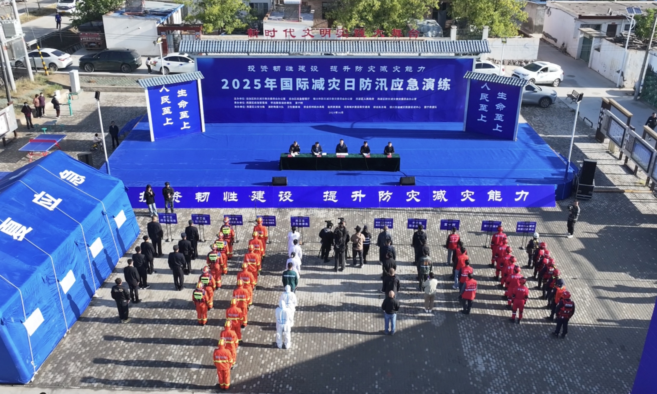 启动仪式后,两场紧扣实战的应急演练随即展开。上午9时,银川市西夏区模拟短时强降雨引发险情,组织富宁村群众紧急转移。演练中,人员有序安置,险情排查与人员搜救同步开展,重点强化了对“一老一小”及特殊人群的防汛应急避险能力。
