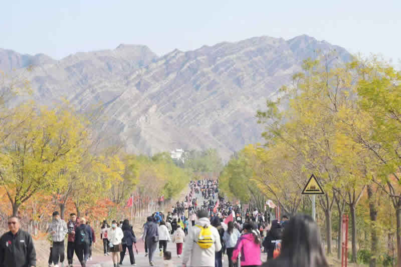 本次徒步活动精心设置了两条特色路线。18.4公里的“徒步贺兰组”从森林公园南门启程,途经旱生植物园、归德沟口、红叶公路等景点,沿途火炬树红叶似火,与山路上的红叶图案交相辉映,形成一条流动的秋色长廊。7.8公里的“悦享红叶组”以森林公园东门为起点,道路平缓舒适,特别融入了汉服文人吟诗、岳家军互动等情景表演,让参与者在漫步红叶海洋的同时,体验穿越时空的文化韵味。