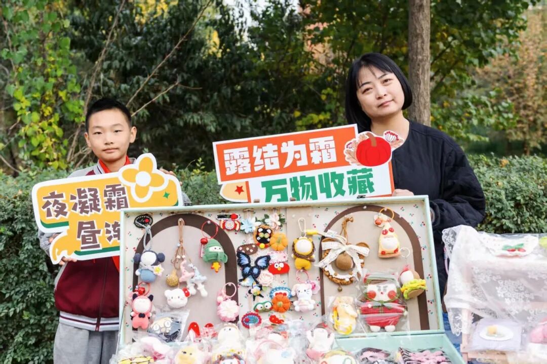 “定格温暖”艺术创作环节率先启动。学生们分为三组,在老师的带领下与环卫工人共同完成手工创作,这些作品不仅展现了学生们的艺术创造力,更成为连接校园与环卫工人情感的桥梁。校园内设置了非遗展示区,葫芦烙画、彩绳编织等传统技艺吸引师生驻足体验。霜降文化课堂上,老师生动讲解“霜降三候”与民间习俗,学生齐声朗诵《山行》《霜降》等经典诗词,感悟自然时序之美。