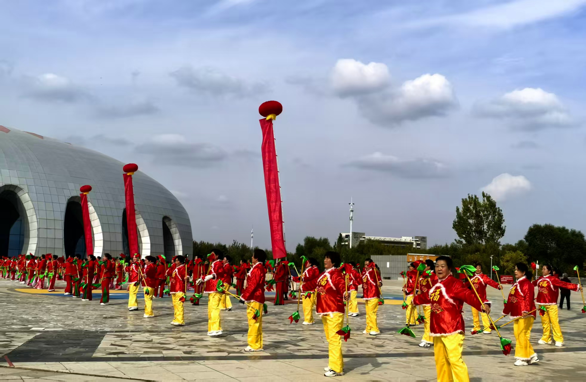本次活动采用“主会场+分会场”联动模式,将尊老敬老的浓厚氛围与多元服务深度融合,为广大老年朋友和参与者呈现一场内容丰富、情意浓厚的重阳盛宴。在活动暖场环节中,大型黄羊钱鞭展演、中医院八段锦等表演充分展现老年人的精神面貌和文艺风采。
