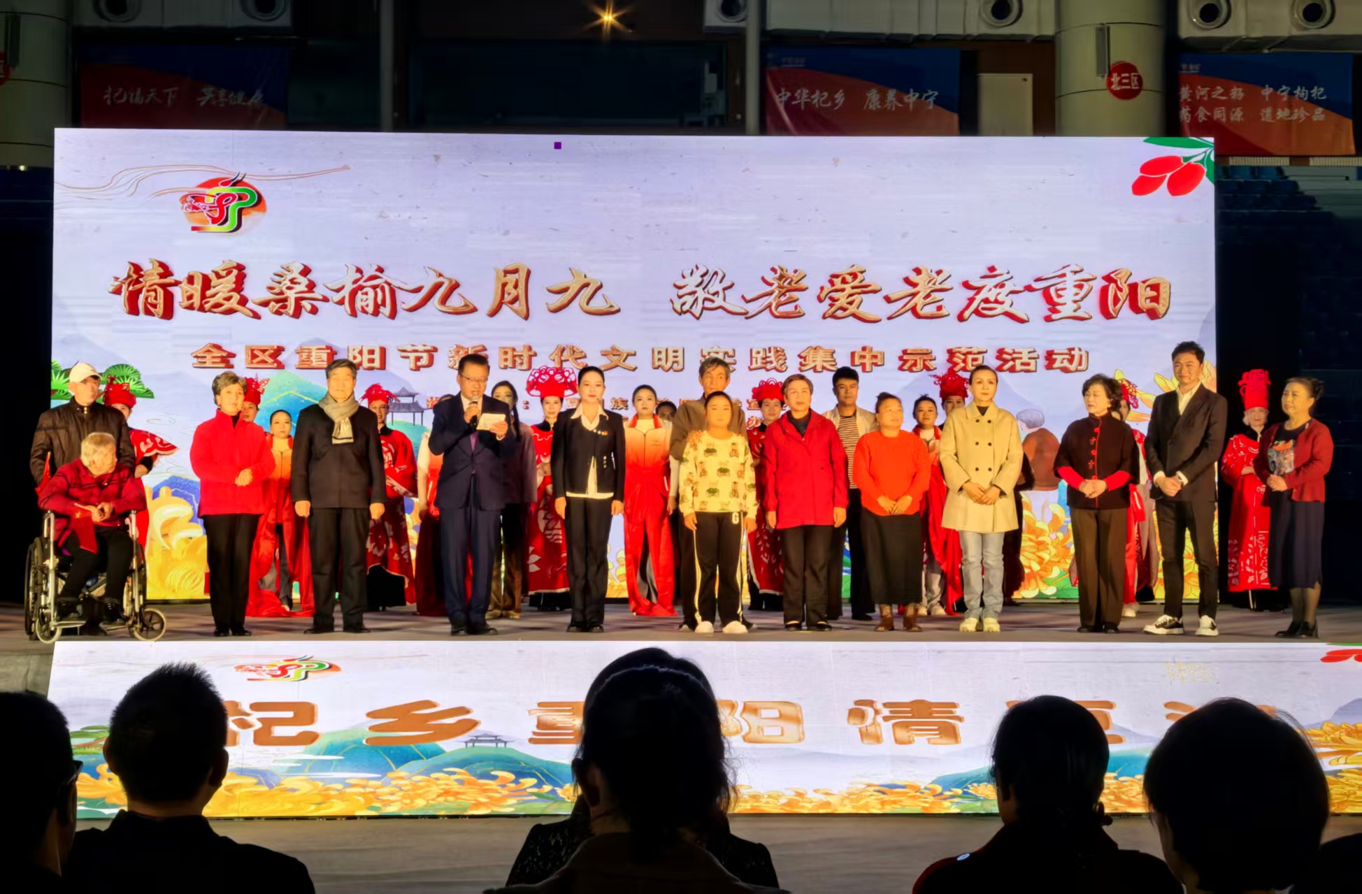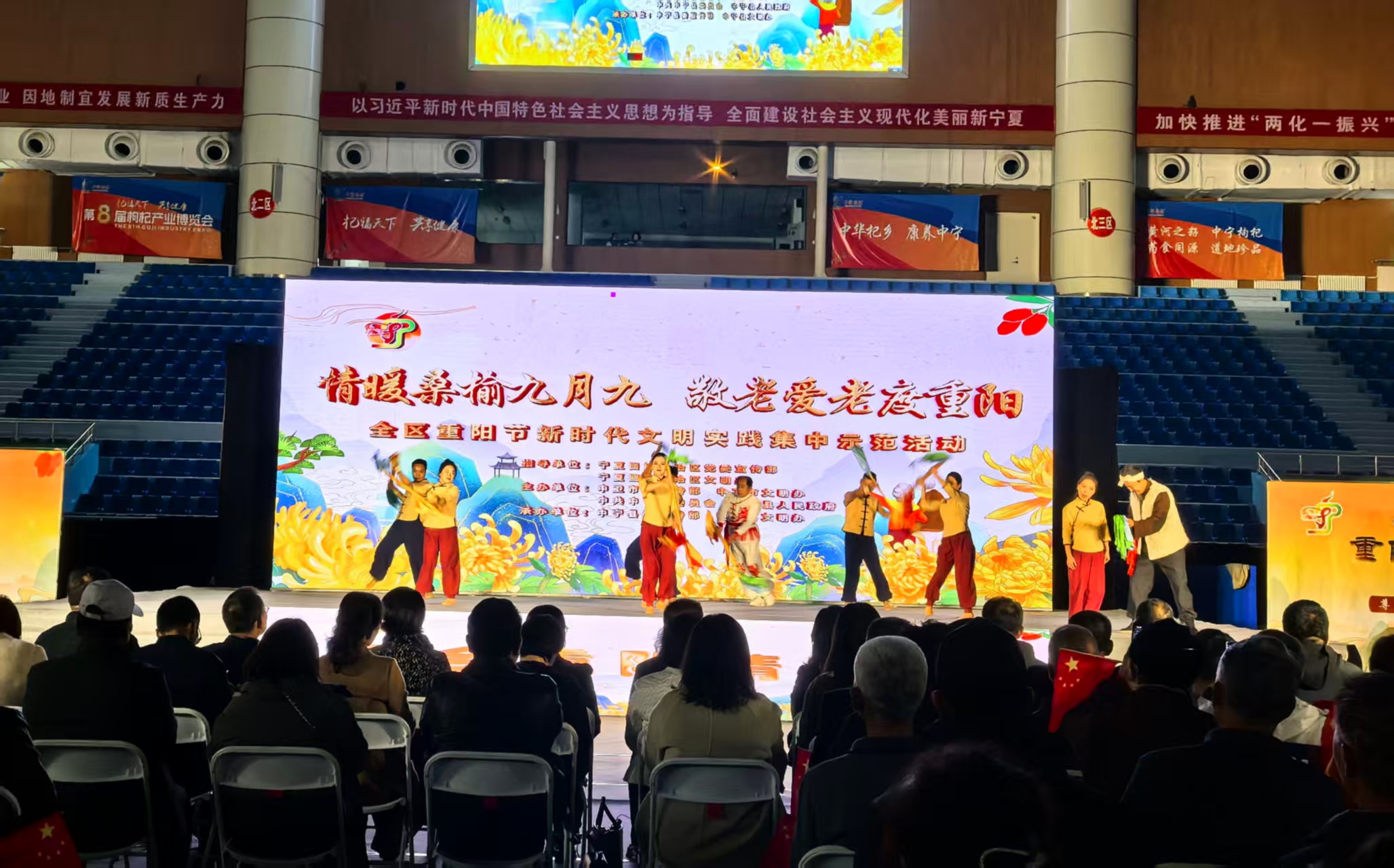 宁夏新闻网讯(记者 胡琴 文/图)10月24日,由宁夏回族自治区党委宣传部、文明办指导,中卫市委宣传部、中卫市委文明办、中共中宁县委员会、中宁县人民政府主办,中宁县委宣传部、中宁县文明办承办的全区“情暖桑榆九月九 敬老爱老度重阳”新时代文明实践集中示范活动在中宁县杞乡黄河体育中心举办。旨在弘扬中华民族尊老敬老的传统美德,传递社会正能量,营造尊老敬老、孝老爱亲的节日氛围。