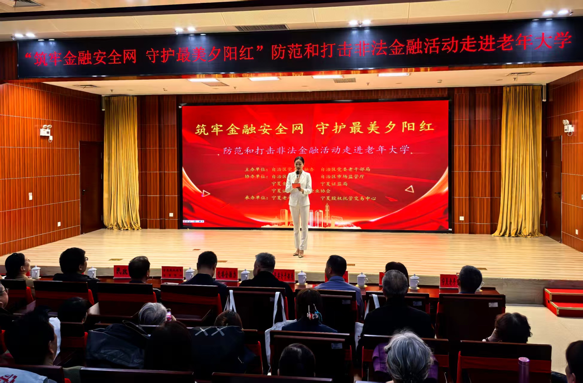 宁夏新闻网讯(记者 胡琴 文/图)10月30日,由自治区党委金融办、党委老干部局主办,自治区民政厅、市场监管厅、宁夏金融监管局、宁夏证监局、宁夏老年大学等协办的防范和打击非法金融活动“七进”系列宣传之——“走进老年大学”专场顺利举行,200余名老年大学学员现场参与了宣传活动。