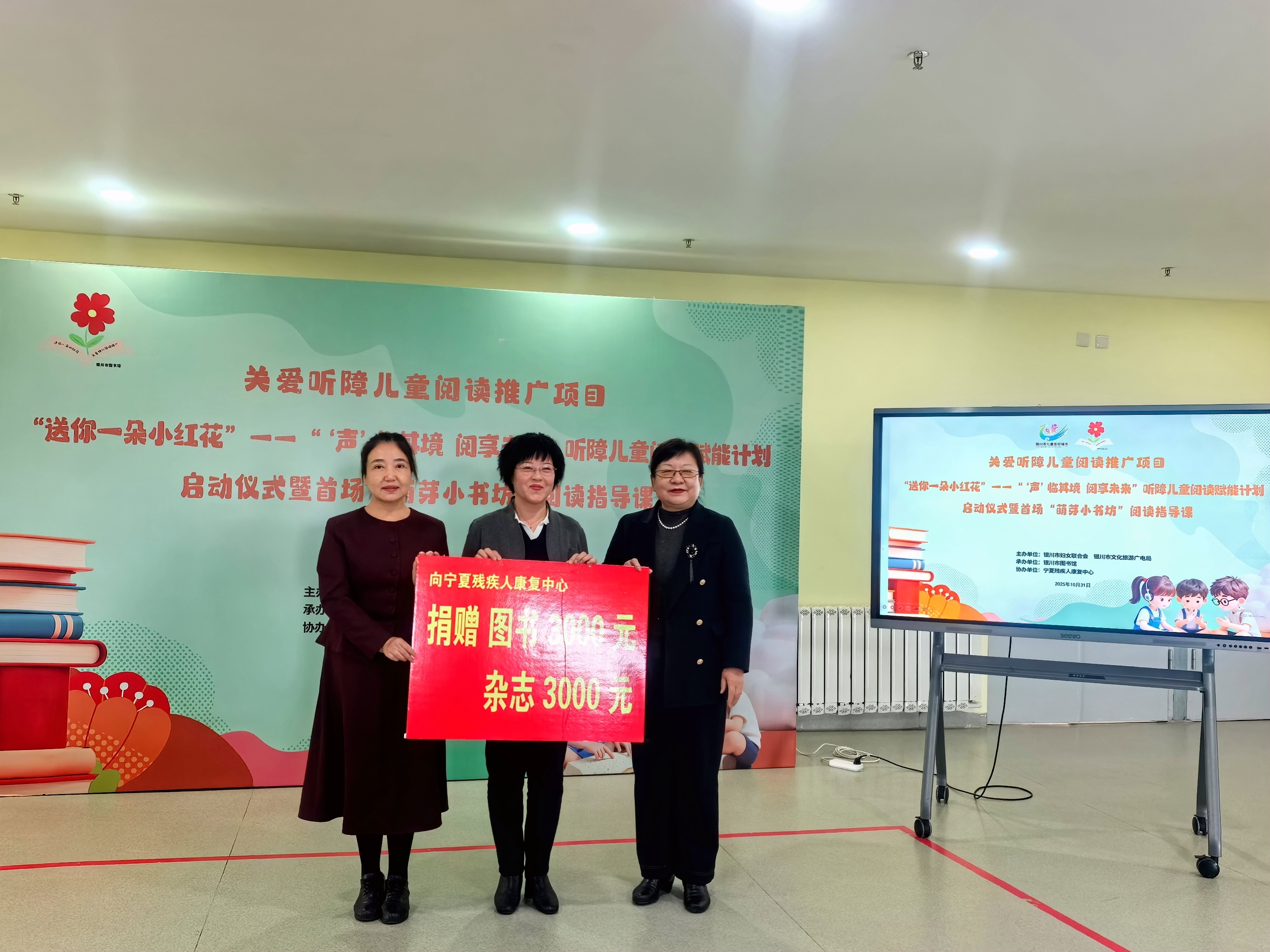 启动仪式在温馨愉悦的氛围中进行。银川市妇联、银川市文化旅游广电局、银川市图书馆等单位,向宁夏残疾人康复中心捐赠了用于建设“爱心图书角”的书籍。现场,嘉宾与家长代表共同将写满寄语的“小红花”心愿卡悬挂于主题展示区,传递社会各界对听障儿童的温暖陪伴与殷切期望。