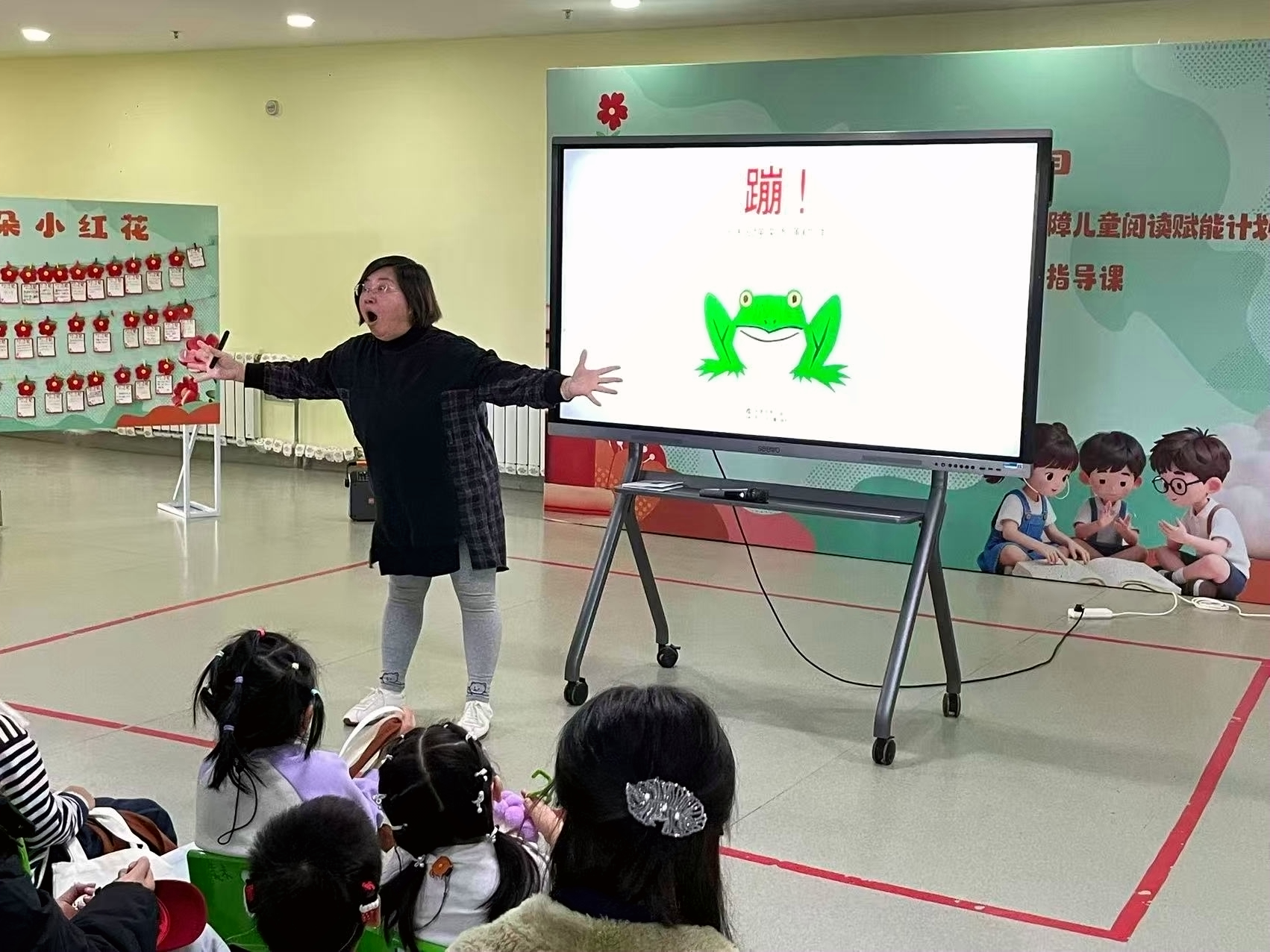 启动仪式后,首场“萌芽小书坊”阅读指导课随即开展。课程围绕绘本《蹦!》展开,在专业老师的引导下,孩子们通过模仿、游戏与互动等环节,积极参与,释放天真活力,充分感受阅读的乐趣。课程不仅有效激发了听障儿童的阅读热情,也对其语言表达与社交能力进行了针对性锻炼。