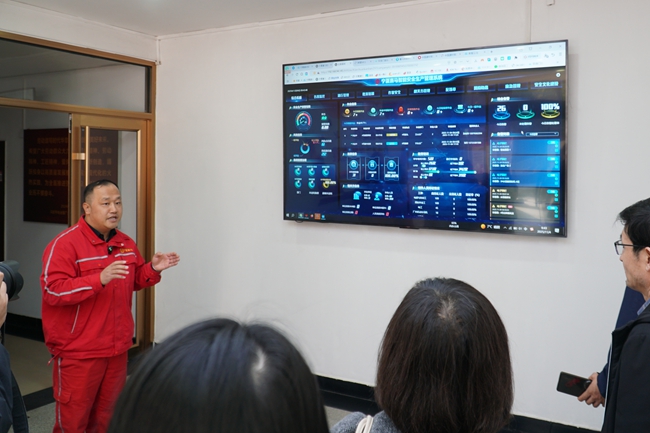 宁夏赛马水泥负责人(左)向记者们介绍智能安全生产管理系统。