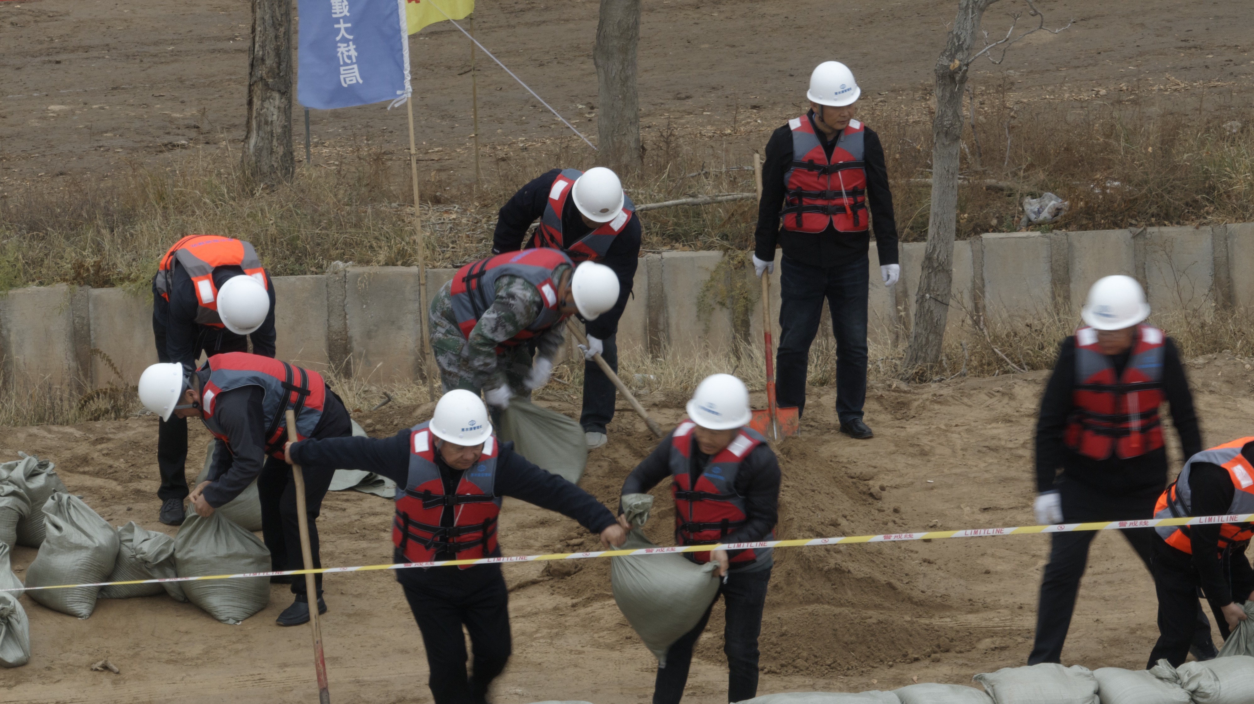 演练前,抢险救援、疏散警戒、医疗救护、后勤保障、通讯联络五个专项小组待命;配备了沙袋、救生圈、AED等应急物资并完成模拟场景布设。