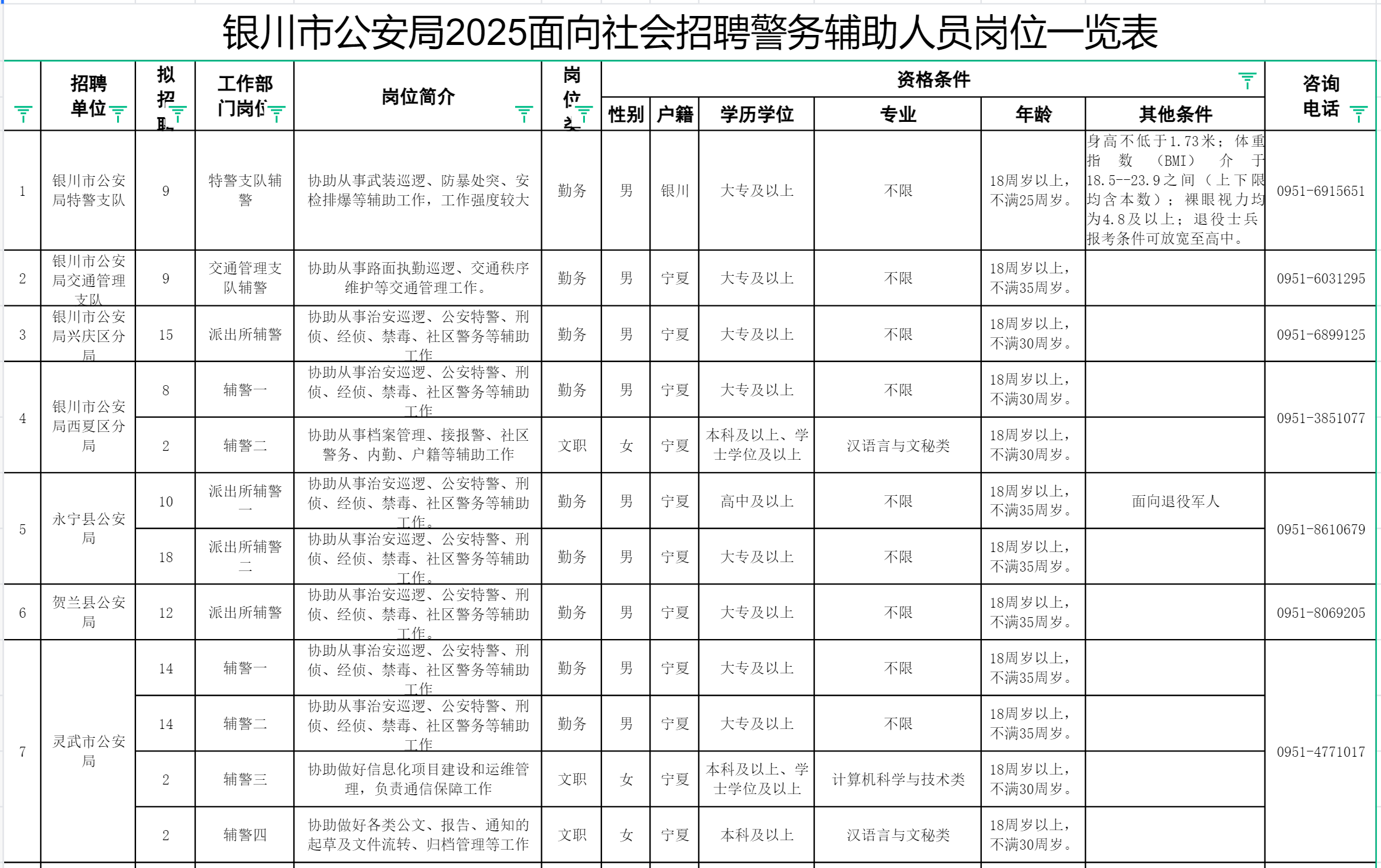 宁夏新闻网讯(记者 胡俊)为进一步加强基层基础工作,有效解决公安机关警力紧缺问题,11月13日,银川市公安局发布公告,将组织实施2025年警务辅助人员招聘工作,面向社会公开招聘辅警153名。