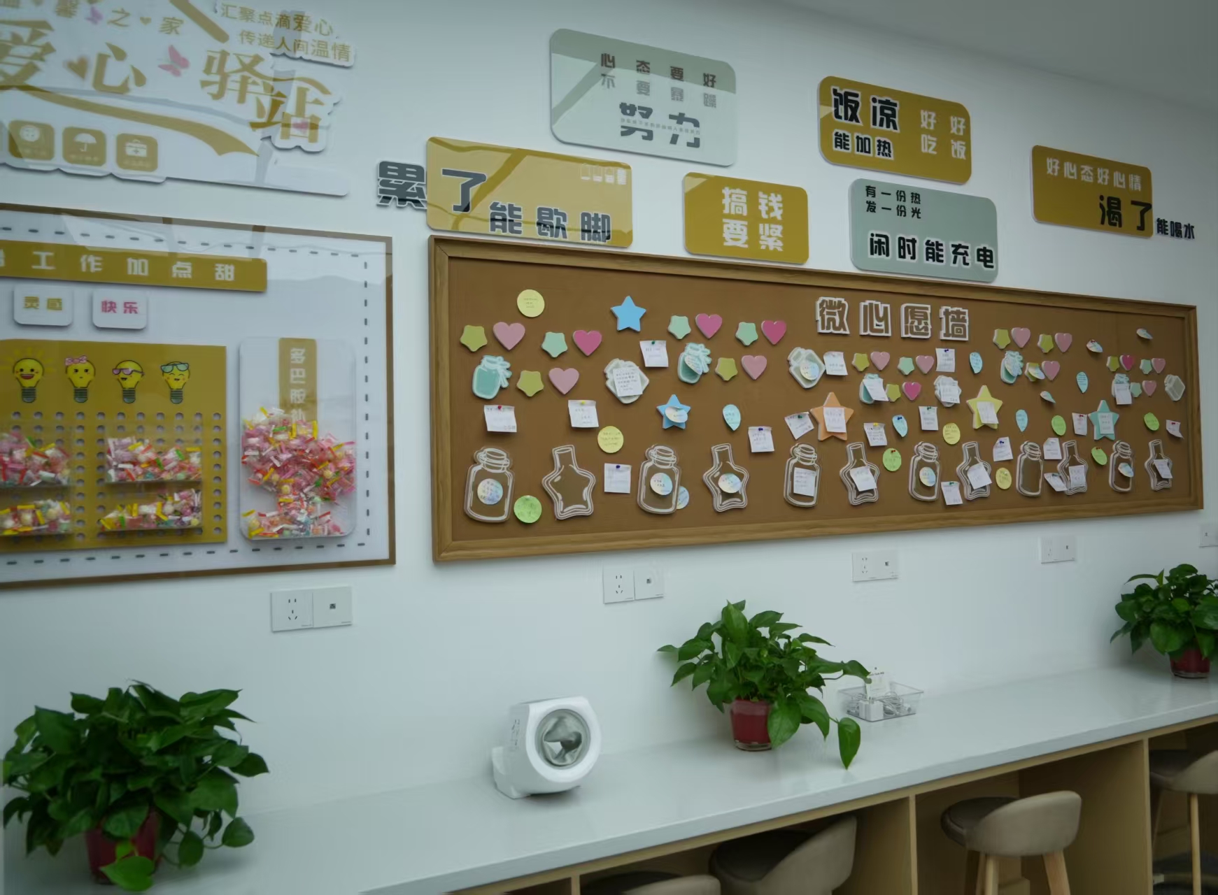 驿站的核心在于提供精准、全天候的服务。一楼生活服务区配备了饮水机、微波炉、冰箱、充电设备等基础设施,切实解决了骑手们“吃饭、喝水、休息”的基本需求。特别设置的24小时茶水间,采用人脸识别系统,确保温暖服务全天候在线。此外,驿站还构建了“4个工会驿站+21个商户微驿站”的联动服务网络,通过与周边商户合作提供积分兑换、折扣就餐等多元化服务,将工会的温暖延伸到商圈的每一个角落。