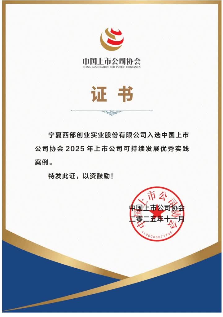 宁夏新闻网讯(记者 杨兆莲)记者11月21日从西部创业公司了解到,在18日举行的2025中国上市公司可持续发展大会上,西部创业凭借其在履行社会责任、多维度推进乡村振兴以及构建特色帮扶体系等方面的卓越实践,成功入选“2025年上市公司可持续发展优秀实践案例”。这是该公司继2024年荣获“上市公司乡村振兴最佳实践案例”后,在可持续发展领域再获权威认可,彰显了其在环境、社会及治理(ESG)领域的持续深耕与突出成效。