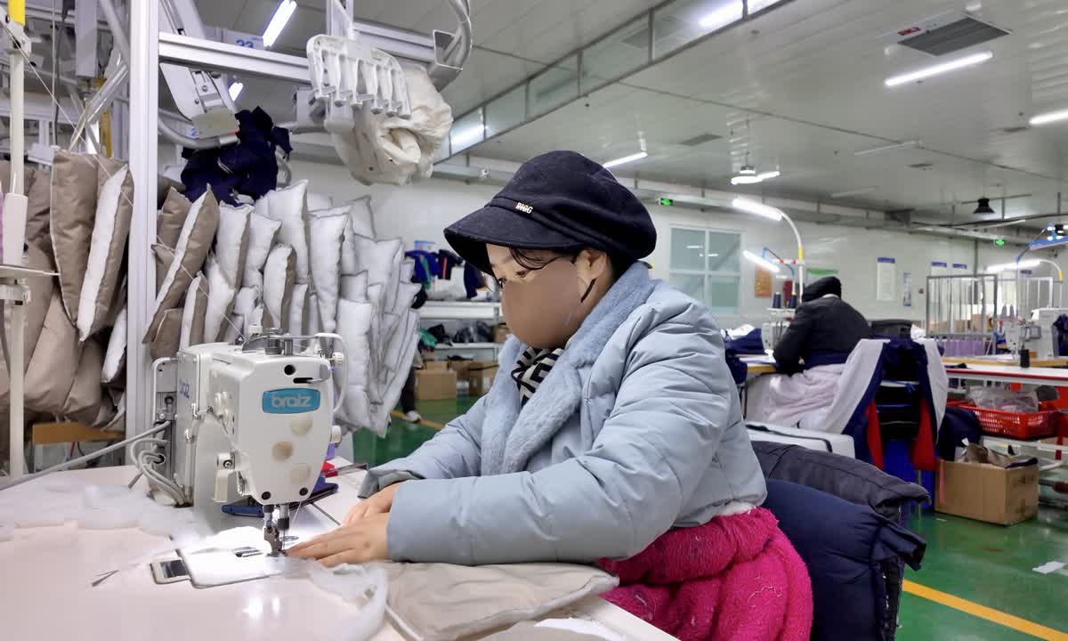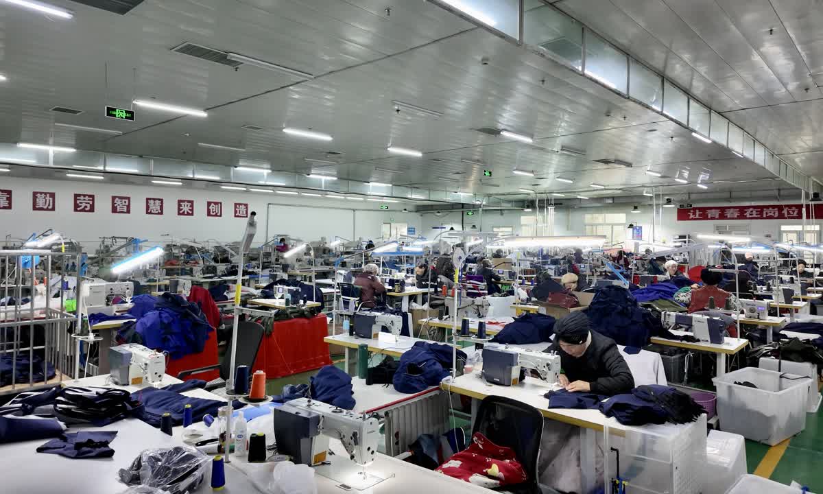 裁剪区,剪刀在女工的巧手中上下翻飞,一件校服上衣雏形已现;缝纫区,女工熟练地踩踏缝纫机,校服、棉衣等布料变成了新颖靓丽的成衣;锁边熨烫区,成衣先被女工二次锁边,挂浆熨烫后,成衣瞬间变得笔挺。