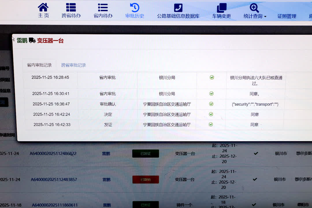 待交通执法人员现场勘验上传数据后,15分钟内,银川分局及宁夏交通运输厅政务服务大厅窗口已完成线上审批确认,决定发证,司机师傅将拉载变压器前往目的地。