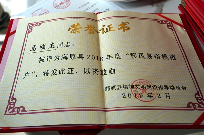 马明杰获得的“移风易俗模范户”荣誉证书。
