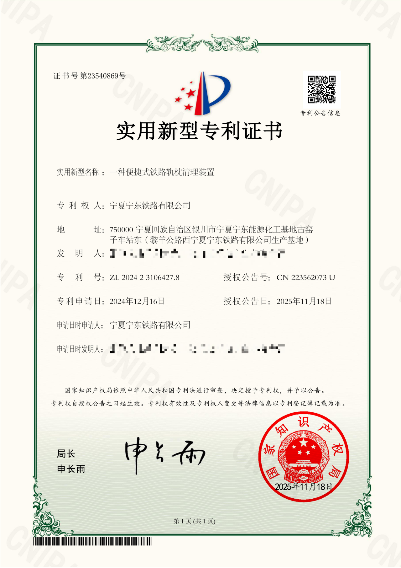宁夏新闻网讯(记者 杨兆莲)记者12月9日从西部创业公司了解到,近日,西创宁东铁路公司工电段“张华创新工作室”自主研发的“便捷式铁路轨枕清理装置”正式获得国家知识产权局颁发的实用新型专利证书。这项源于一线、用于一线的技术创新,标志着宁东铁路公司在铁路养护装备实用化创新领域迈出关键一步。