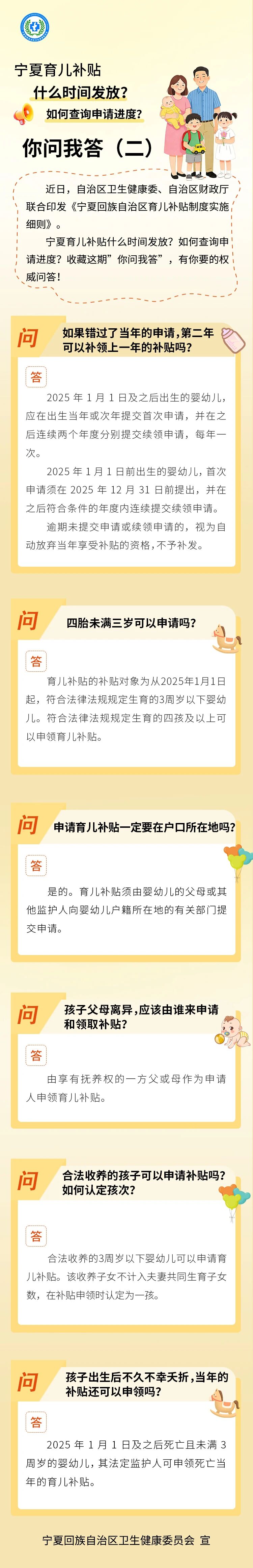 12月9日,经自治区党委、政府同意,自治区卫生健康委、自治区财政厅印发《宁夏回族自治区育儿补贴制度实施细则》,即日起执行,符合条件的婴幼儿家长可以申领。媒体发布消息后,许多婴幼儿家长询问:宁夏育儿补贴什么时间发放?如何查询申请进度?如何认定孩次?离异家庭谁来申请和领取?12月12日,自治区卫生健康委发布“你问我答”长图,集中回答相关问题。(宁夏新闻网记者 尤天竹 长图来源:自治区卫生健康委)