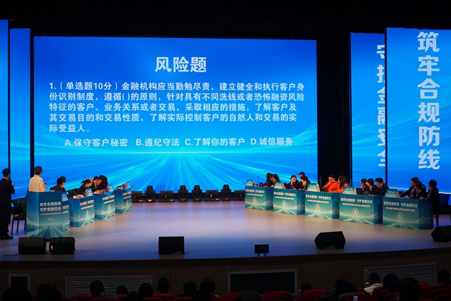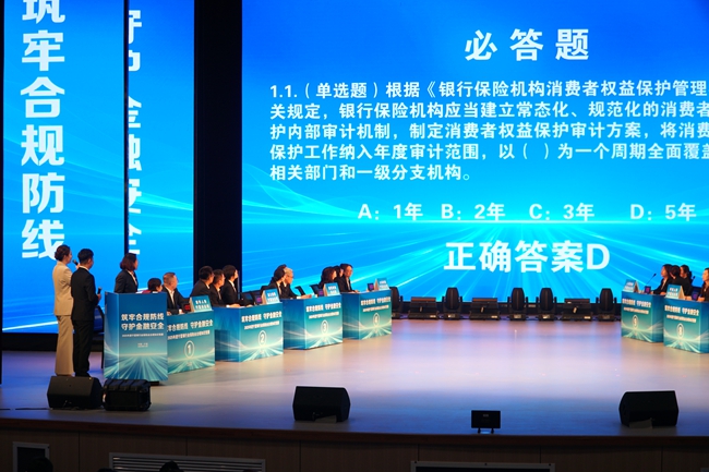 本次大会旨在通过“以赛促学、以学促用”的生动形式,全面总结专项行动成效,并部署下一阶段工作,着力提升全员合规专业素养,积极营造“人人合规、主动合规”的浓厚文化氛围。竞赛环节紧张激烈,精彩纷呈。经过前期线上选拔赛,银行与保险机构分别有9支队伍脱颖而出,进入决赛。每支队伍由3名场上选手及2名场下智囊团成员组成。