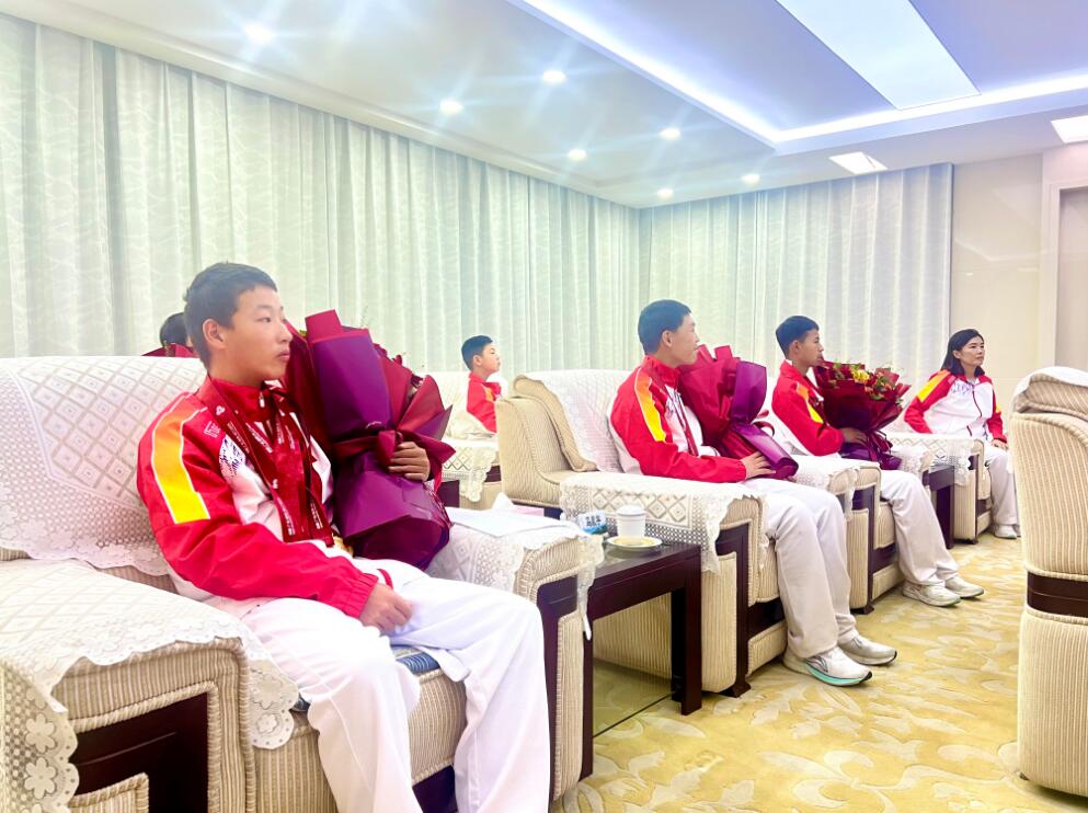 当天下午,家乡群众代表、相关部门负责人及运动员家属早早等候在银川河东国际机场迎接现场,手持鲜花与横幅,用热烈的掌声和欢呼声迎接英雄们回家,现场洋溢着喜庆热烈的氛围,每一张笑脸都饱含着对健儿们的敬意与自豪。