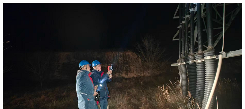 夜间是负荷高峰期,白天不易观测的设备缺陷此时更易暴露。龙源运维抢修(试验)中心组织人员对该线路进行细致夜间巡查,重点排查导线连接处过热、绝缘子污秽引发的火花放电或电晕现象等潜在隐患。工作人员对16基杆塔、绝缘子等关键部位逐一检查,借助红外测温仪精准捕捉接头发热等隐蔽缺陷。