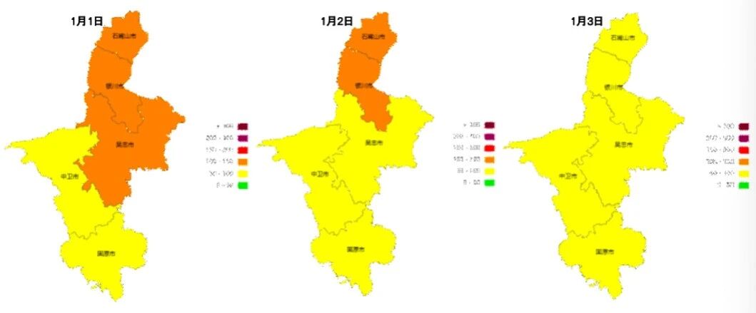 1月1日,区域大部湿度较高。受跨年夜烟花爆竹燃放累积影响,银川都市圈小时轻度及以上污染风险较高。全区环境空气质量预计为良至轻度污染,首要污染物为PM2.5。