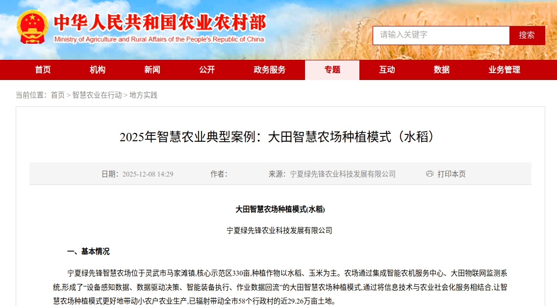 宁夏新闻网讯(记者 杨兆莲)记者12月31日从灵武市委宣传部了解到,近日,农业农村部公布“2025年智慧农业典型案例”,灵武市大田智慧农场水稻种植模式成功入选,成为全国16个示范推广的典范之一。