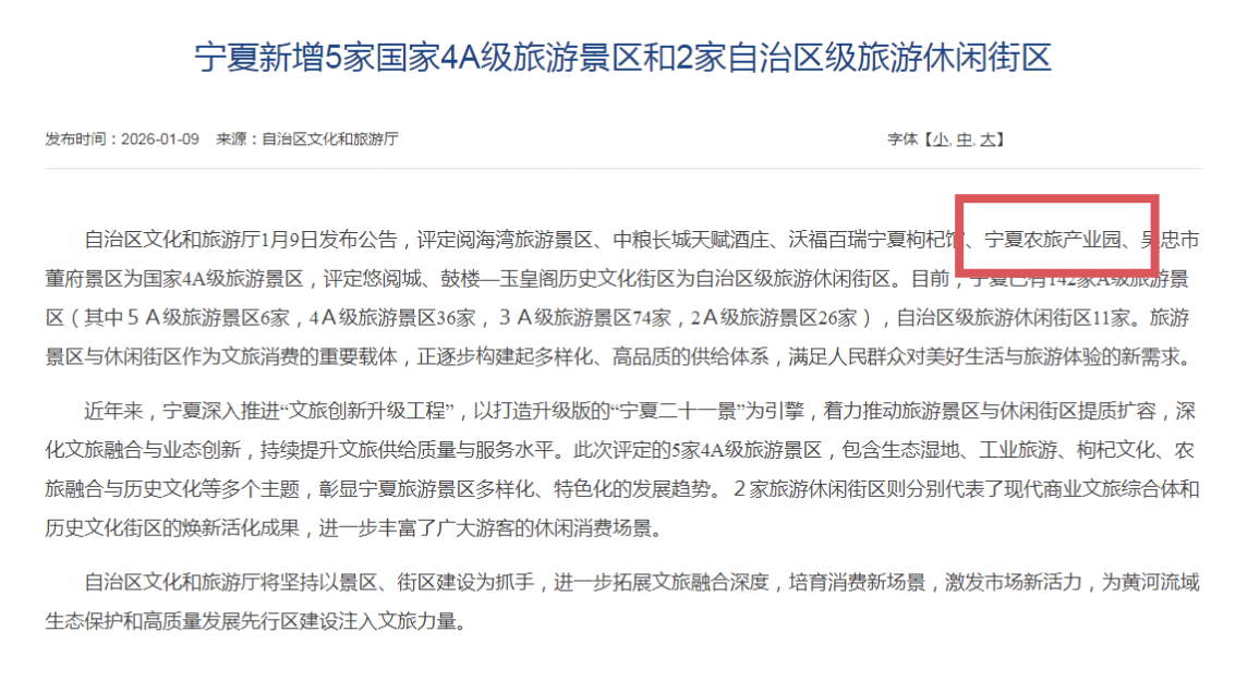 宁夏新闻网讯(记者 杨兆莲)记者1月9日从宁夏农垦获悉,宁夏农垦农旅产业园成功跻身国家4A级旅游景区行列。根据自治区文化和旅游厅最新公告,本次全区共新增5家4A级景区,宁夏农垦农旅产业园凭借其鲜明的农文旅融合特色与优质资源脱颖而出,为宁夏文旅产业发展再添新名片。