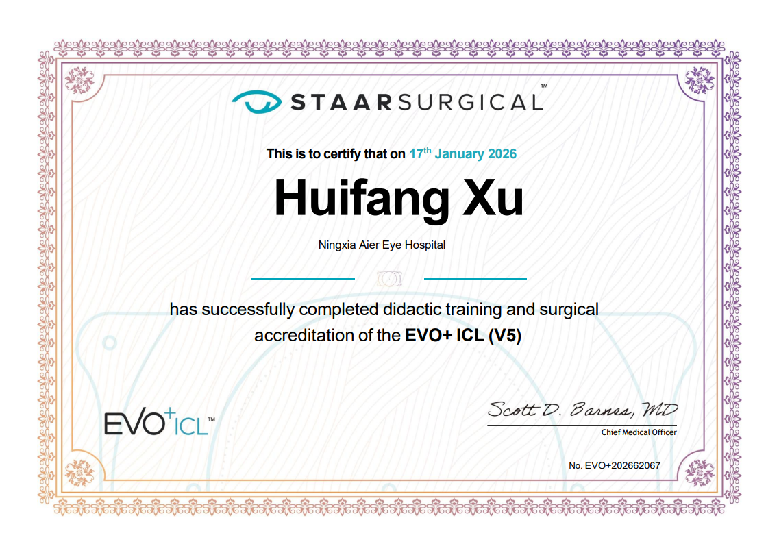 此次手术的主刀医生、宁夏爱尔眼科医院院长徐惠芳,拥有30余年眼内镜手术经验,是国内较早开展ICL晶体植入手术的专家之一。凭借扎实的专业功底和丰富的临床实践,她不仅斩获“EVO ICL超5000例专家”称号,还先后荣获“EVO ICL手术项目区域杰出贡献奖”“EVO+ICL(V5)新技术临床应用认证医生”等多项行业资质,从业以来成功实施内眼手术超3万例,为这项国际前沿技术在宁夏的顺利落地提供了坚实的专业支撑。