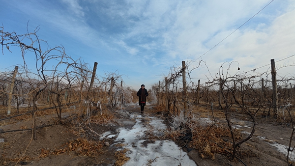 宁夏新闻网讯(记者 王莹 文/图)1月18日,宁夏迎来寒潮天气,绝大多数葡萄园已覆土静待春天,而位于贺兰山东麓最北端的玖禧酩庄,却呈现出一幅迥然不同的画面:近500亩葡萄园中,藤蔓直立于寒风,枝干裹满晶莹冰霜,在冬日阳光下闪烁如银。庄主谭志勇在近零下20摄氏度的严寒中,穿梭其间,手持设备进行直播,带领屏幕另一端的观众实时走进这片“不眠的葡萄园”,直观感受中国葡萄酒产业在风土与科技融合中的坚韧探索。