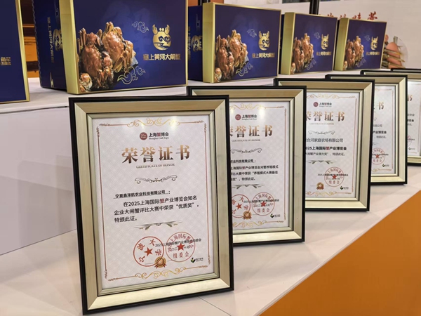 作为兴庆区蟹产业的骨干企业,宁夏鑫泽航农业科技发展有限公司包揽4项大奖。在2025首届国际名厨蟹王争霸赛暨第二届上海蟹博会“蟹韵匠心·名厨共鉴”品鉴会上,其选送的大闸蟹因肉质鲜嫩、膏满黄肥,征服了专业评委的味蕾,斩获“2025年度蟹宴金蟹品质奖”;在河蟹养殖模式暨养殖能手评比大赛中,凭借科学高效的生态养殖技术与标准化管理经验,一举夺得“养殖能手”称号及“养殖模式大赛最佳模式创新奖银奖”;此外,在知名企业大闸蟹评比大赛中,以稳定的品质再度斩获“优质奖”,全方位展现了“塞上黄河大闸蟹”在养殖、品控等领域的综合实力。