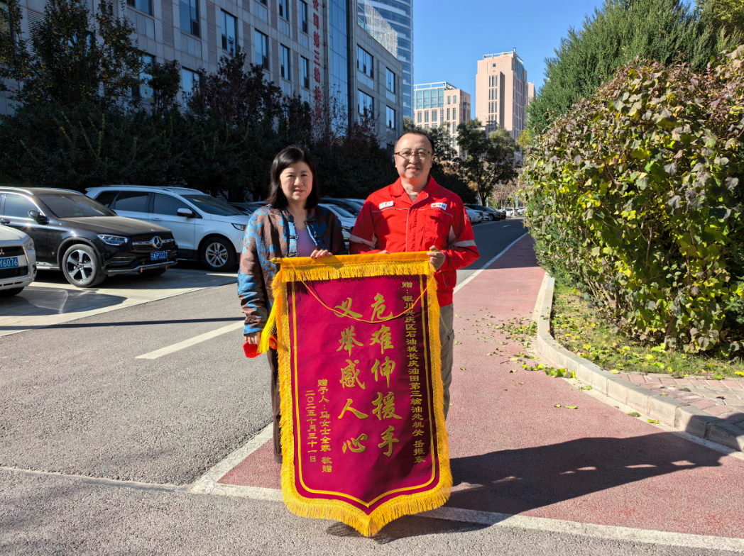 在伤者康复过程中,其家属经过多方打听,终于找到了这位做好事不留名的“活雷锋”。为表达感激之情,他们专程来到第三输油处,将饱含深情的锦旗亲手赠予救命恩人岳振东。
