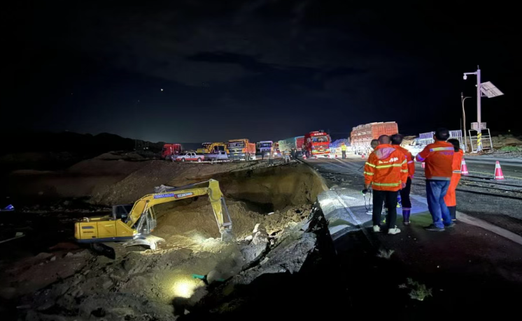 图为2025年7月18日0时50分,国道338线K1702+900处路基水毁处置现场。