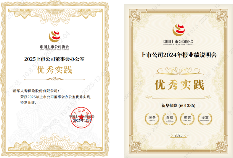 近日,新华保险(A股代码:601336,H股代码:01336)获奖频频——分别在中国上市公司协会、财联社等主办的评选中荣获“上市公司董事会办公室优秀实践”“上市公司2024年报业绩说明会优秀实践”和“最佳市值管理董秘”三项殊荣,公司高质量发展与价值增长成果以及公司治理、信息披露和投资者关系管理工作获得市场充分肯定。