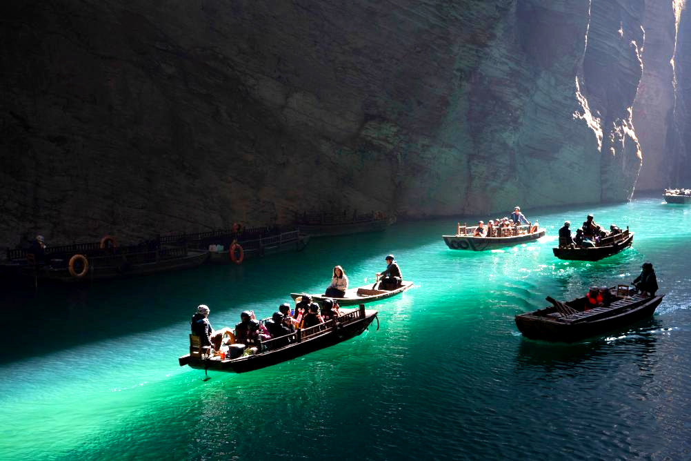 初冬时节,湖北省恩施土家族苗族自治州鹤峰县屏山峡谷迎来迷人景观。正午时分,阳光穿过幽深峡谷,将蜿蜒的“一线天”照亮,舟行水上若悬浮于空中,形成了独特的“舟浮空中”奇观。