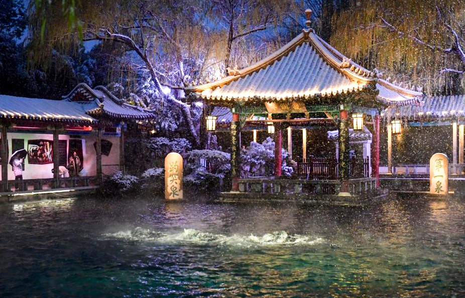 12月12日,山东济南迎来2025年入冬以来首场降雪,济南趵突泉公园里白雪皑皑,美不胜收。