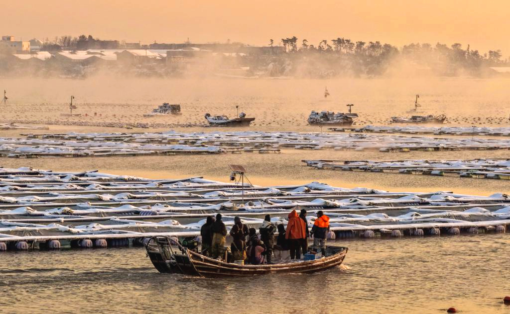 1月12日,雪后的山东省荣成市爱伦湾海洋牧场出现“海浩”景观。据悉,“海浩”景观是一种在严寒天气下出现的自然奇观,表现为海面或湖面上水汽蒸发后遇冷凝结,形成白茫茫的雾气,如同水面沸腾一般。