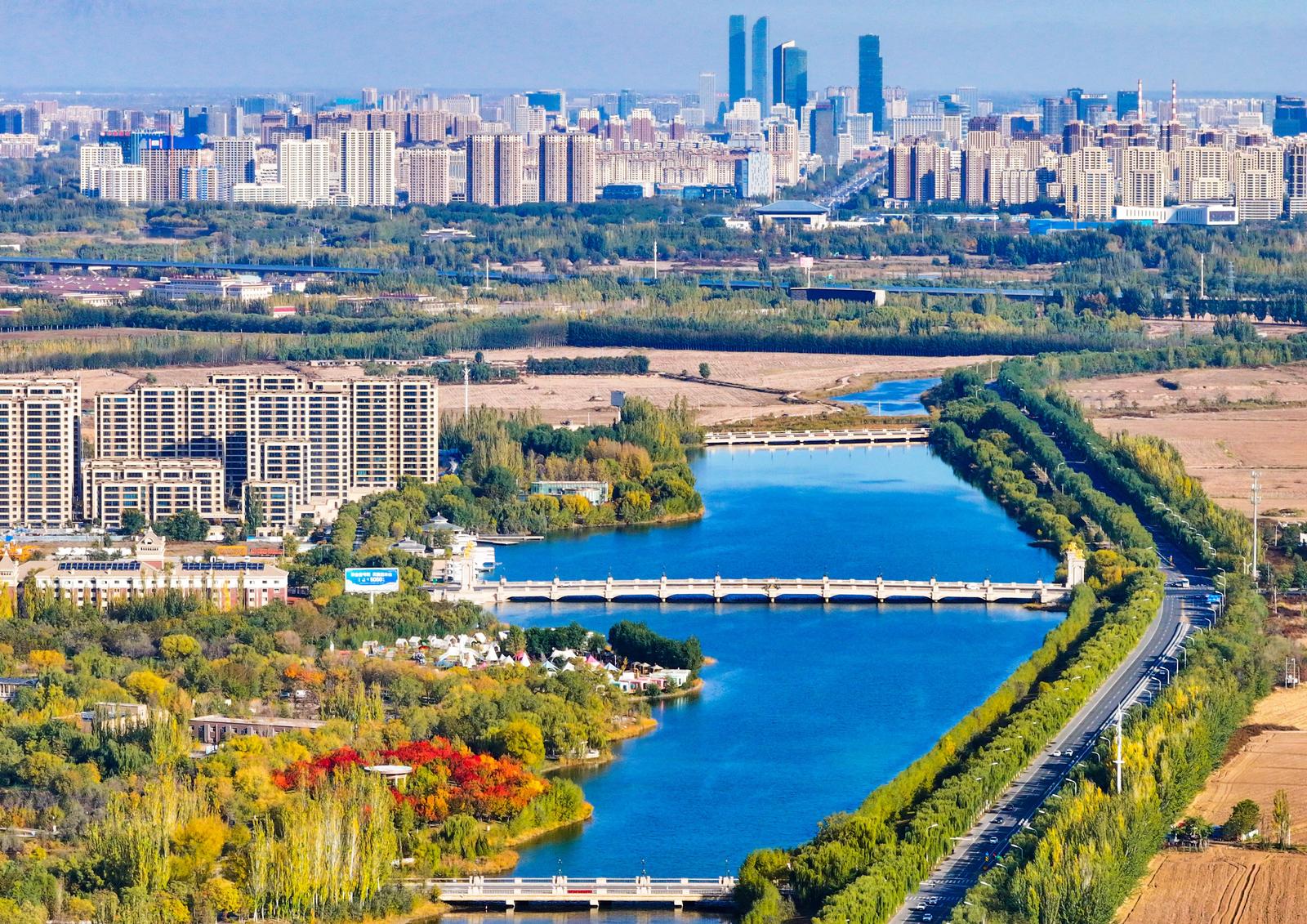 10月26日,从空中俯瞰永宁县西部水系,水系两岸呈现出一幅晚秋时节绚烂夺目的多彩画卷。全长38公里的永宁县西部水系,不仅是永宁县防洪排水体系的重要组成部分,还是重要的生态景观和天然氧吧。记者 马楠 摄