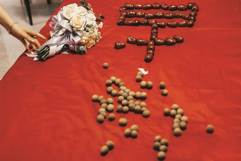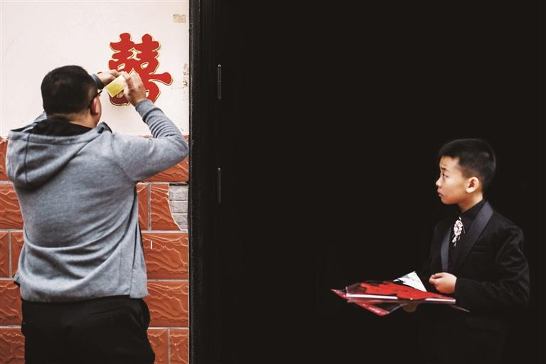 一大早,家人们在单元门口忙着贴喜字。