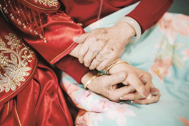 接亲离别之际,新娘和奶奶依依不舍地牵着手。