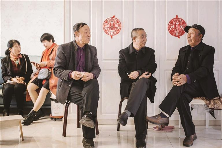 亲朋们在新房里边聊天边等待新人的到来。