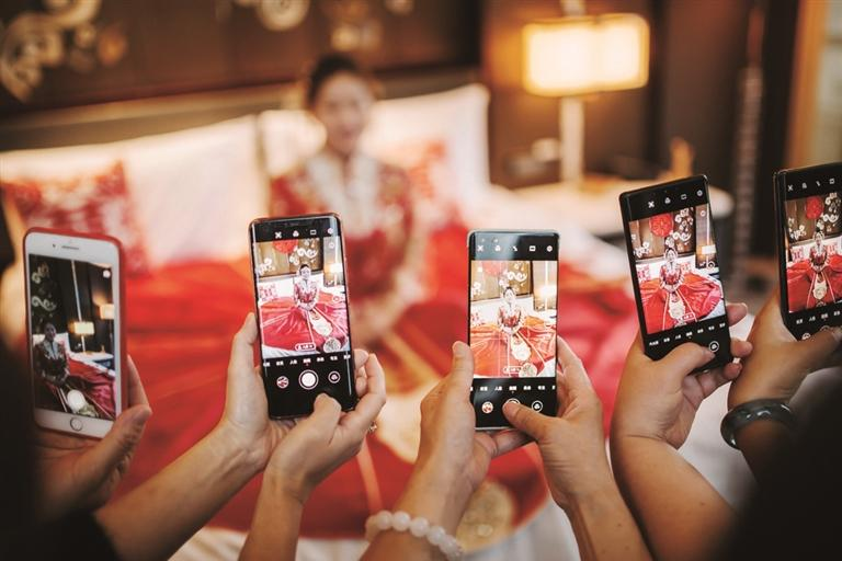 闺蜜们一起给新娘拍照,记录美好瞬间。