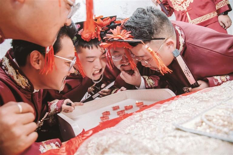 新郎和伴郎们一起玩接亲游戏——吹蜡烛。