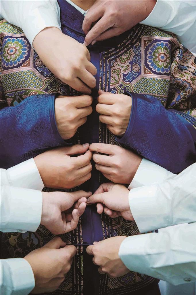 伴郎们一起为新郎整理蒙古族传统婚礼服饰。