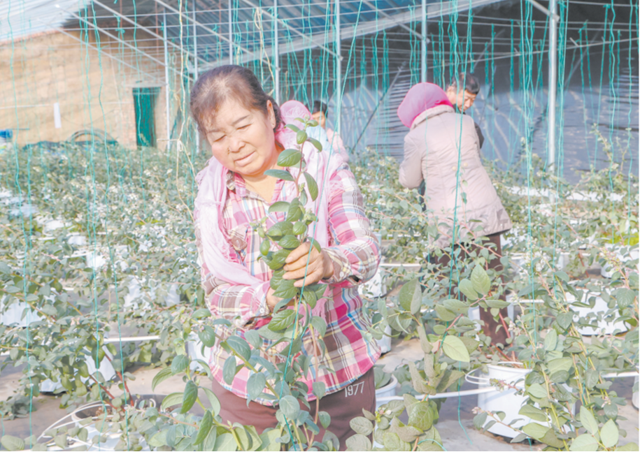 近日,平罗县黄渠桥镇五星村的温室大棚里,一株株蓝莓苗整齐排列,星星点点的小白花点缀枝头,生机盎然。 今年以来,该村紧盯市场,积极争取自治区蔬菜绿色标准园创建项目资金,引进660盆蓝莓种苗试种,为园区大棚再添新活力,开拓出增收之路。 记者 赖盛龙 摄