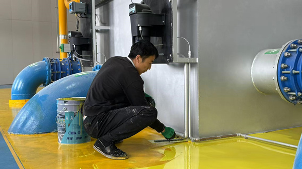 10月24日,银川都市圈城乡西线供水平罗配套工程(二水厂新建地表水净化设施)已全部完工。平罗县德渊城乡水务有限公司项目负责人郭卫兵现场指挥施工最后一道关键工序施工——环氧自流平地面,这道工序是保障水厂洁净关键屏障。