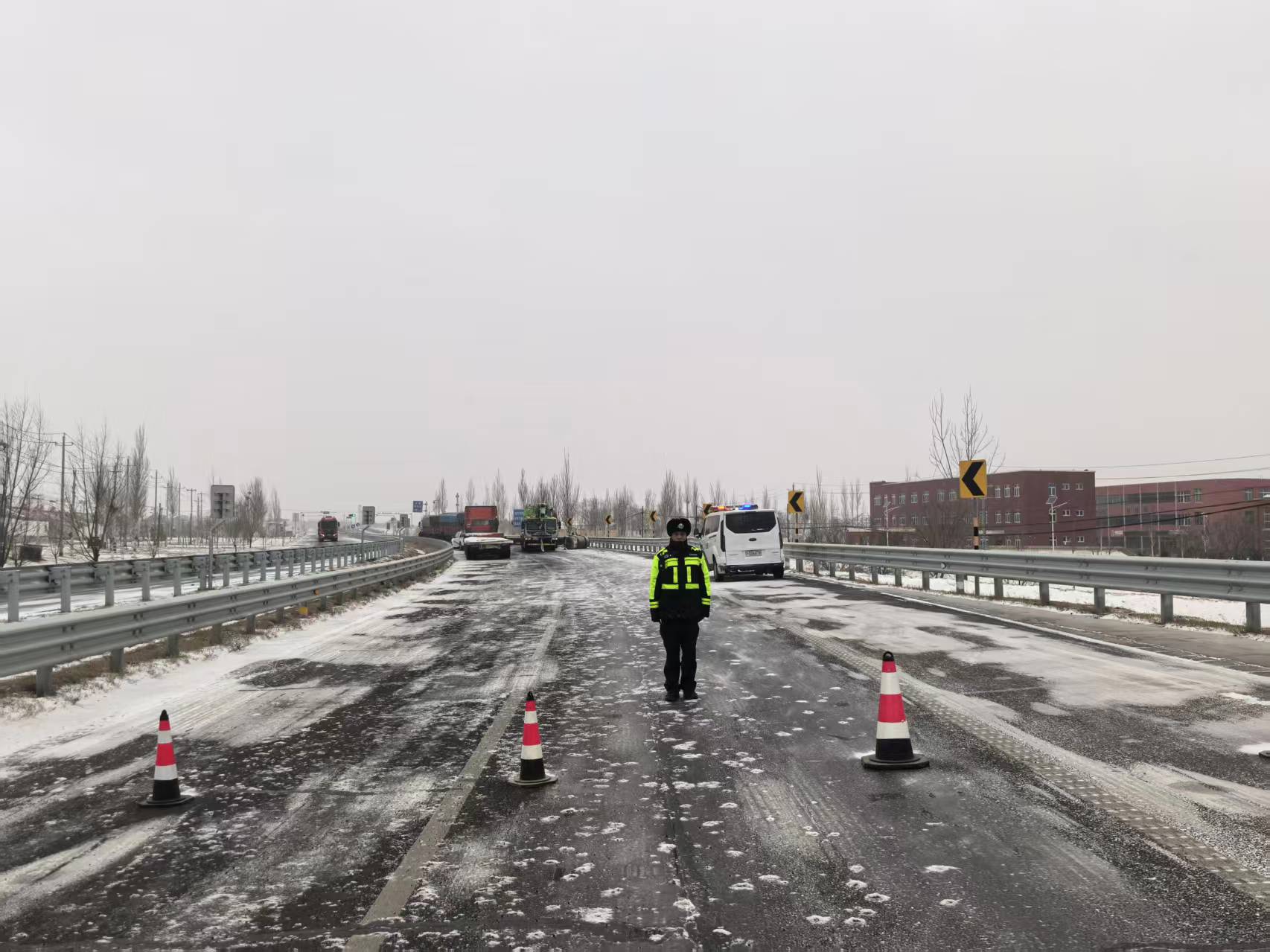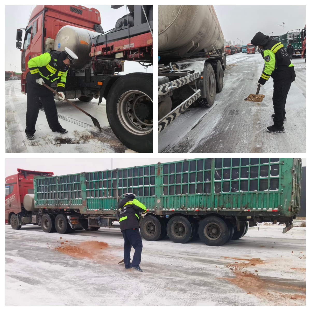 为保障道路通行顺畅,大队强化路面管控,联合公路养护中心对辖区G344、338国道等重点路段施撒融雪剂、防滑沙,全力抗凝保畅。同时,采取路面巡逻与固定岗位执勤相结合的模式,在积雪结冰路段通过亮警灯、鸣警笛、喇叭喊话等方式,引导车辆有序通行,并反复提醒驾驶人减速慢行、保持安全车距、谨慎转弯刹车。
