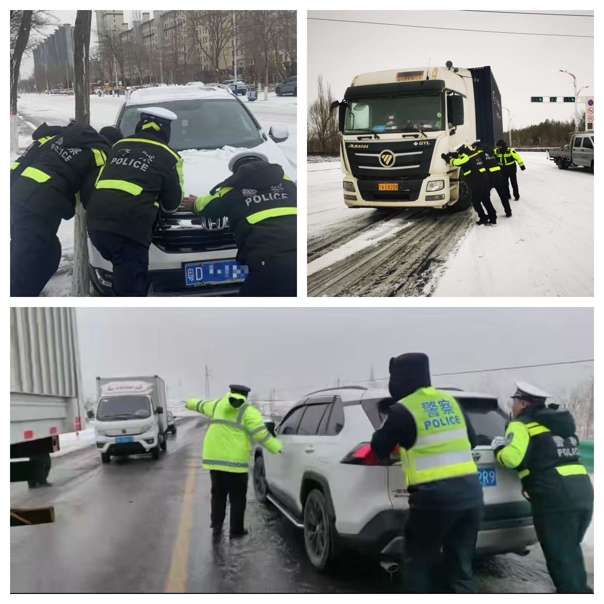 执勤民辅警化身“引路人”“推车人”“铲雪人”,主动为群众排忧解难。城区巡逻组在巡逻途中,发现一辆轿车不慎滑入路边树坑无法脱困。见此情形,巡逻民辅警立即停车上前,一边安抚车主情绪,一边与车主齐心协力展开救援。大家找准发力点,齐声发力将被困车辆推出树坑。成功脱困后,车主对民辅警的及时相助连连道谢。针对雪天路面湿滑、能见度低的特点,民警通过喊话器持续对城区过往车辆进行安全提示,反复引导驾驶员减速慢行、保持安全车距,全力守护城区道路通行安全。