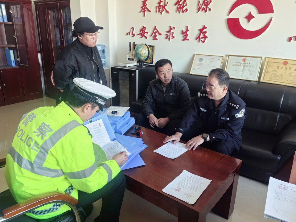 此次检查聚焦运输企业安全管理的关键环节,旨在精准排查安全隐患,督促企业将安全责任落到实处。在新中祥能源贸易有限公司,巡逻中队警员一行首先与企业负责人进行深入座谈,详细了解企业日常运营、车辆管理、驾驶人教育等情况,并重点对企业的行车台账、安全管理制度台账、日常安全检查台账等进行了细致核查。
