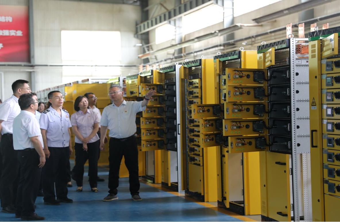 贺兰县税务局党委书记、局长王晓明在宁夏凯晨电气集团有限公司调研,听取负责人讲解机器运行工作。